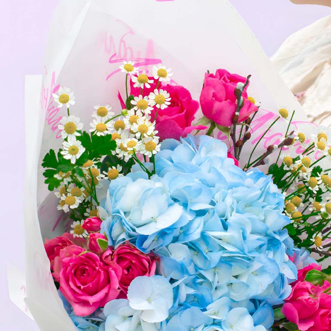 – Игра контрастов: Холодный голубой и горячий розовый оттенки делают букет ярким и заметным.