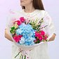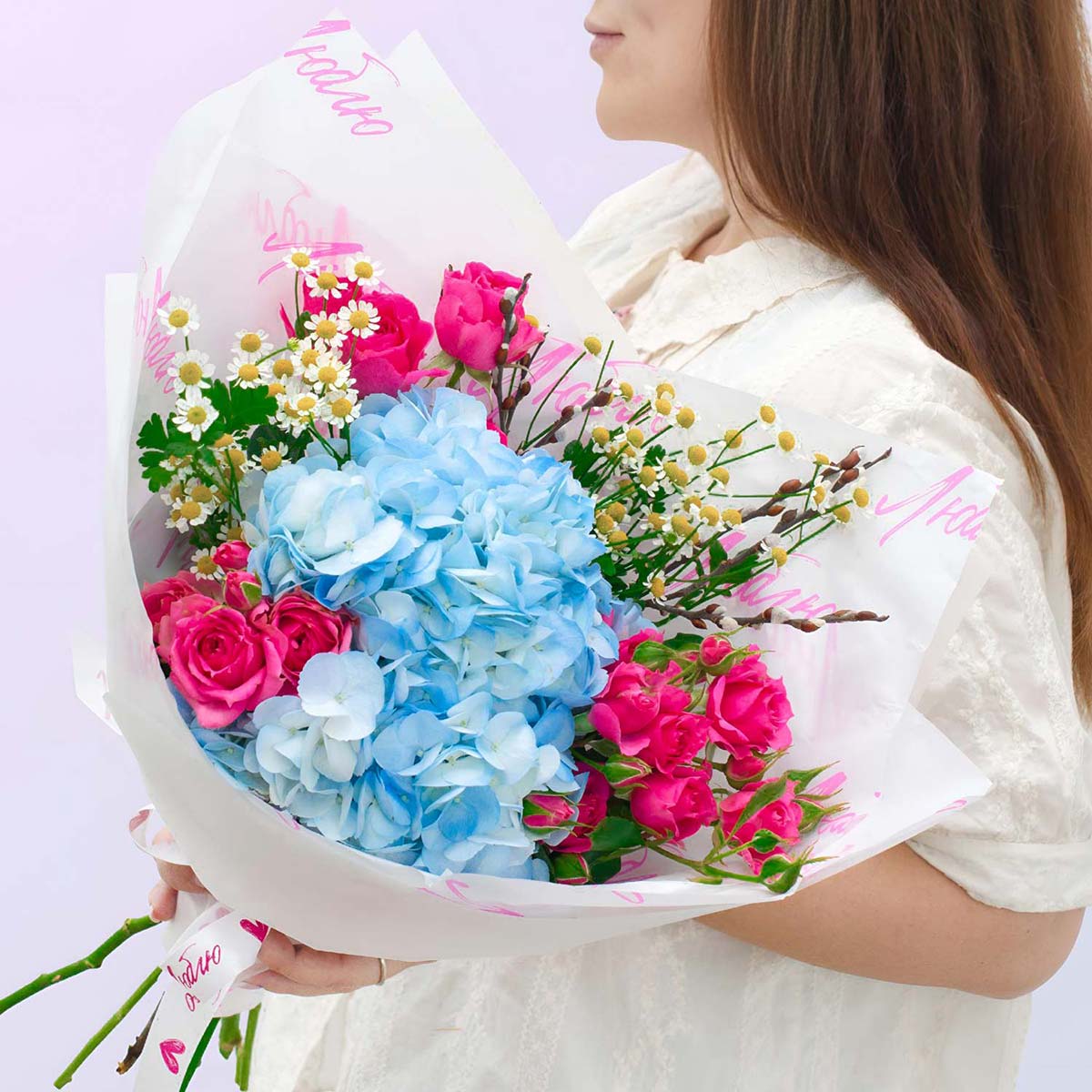 Глоток свежего весеннего воздуха посреди зимы. Мы объединили небесно-голубую гортензию, яркие кустовые розы и трогательные ромашки, добавив веточки вербы для настроения.