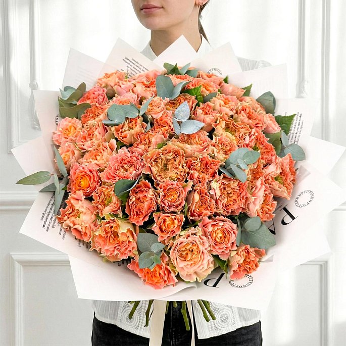 – Трендовое оформление: Светлая матовая упаковка с лаконичным типографическим принтом подчеркивает современный характер букета и выступает идеальным фоном для теплых оттенков роз.