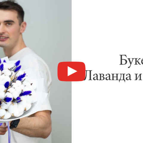 Небольшой букет из сухоцветов - лаванда, 23 цветка хлопка, лагурус. Упаковка - белый лен и атласные ленты.