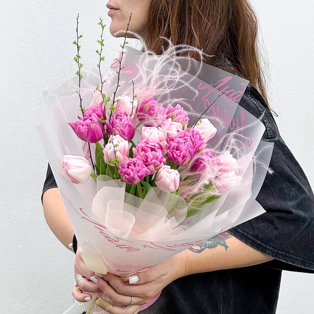 Нежная весенняя история. Мы собрали микс из розовых пионовидных тюльпанов, добавив к ним воздушные декоративные перья и веточки с первыми почками.
