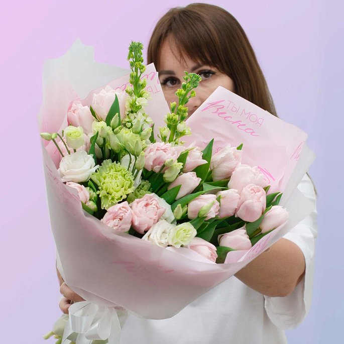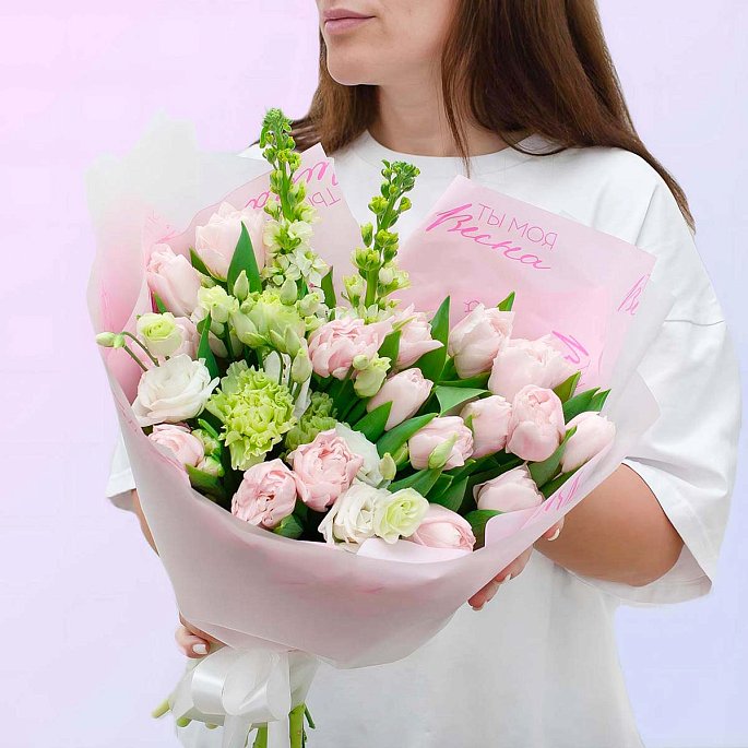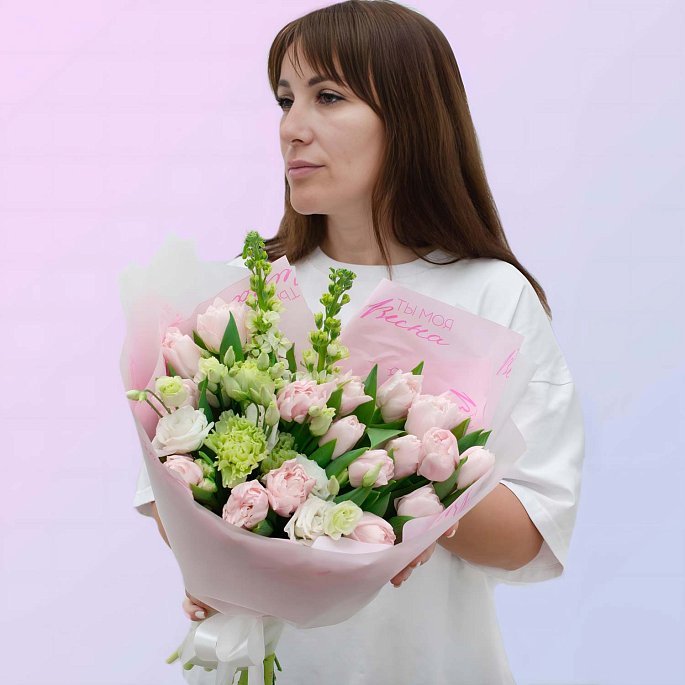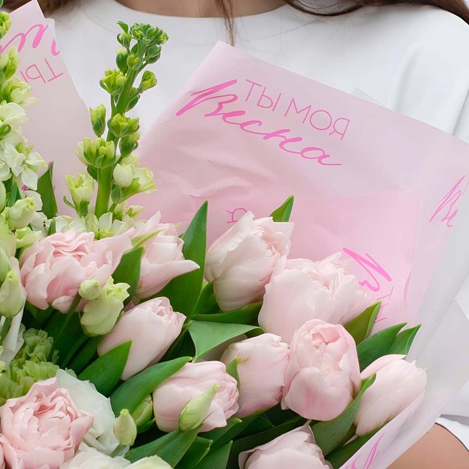Нежный и воздушный весенний букет, выполненный в мягкой пастельной палитре. Композиция объединяет классические розовые тюльпаны, пышную светлую эустому и освежающие вертикальные зеленые акценты. Особенность работы — тематическая матовая упаковка с принтом «Ты моя весна», которая делает этот букет не просто красивым подарком, а красноречивым посланием.