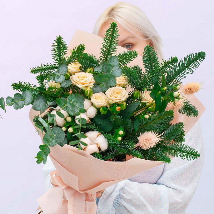 ❄️ Букет "Нежность зимы" ❄️Стильный и атмосферный зимний микс. Здесь мы соединили ароматную хвою, воздушный хлопок и нежные кустовые розы. Букет выглядит объемным, дорогим и очень уютным — идеальный вариант, если не хочется дарить банальные розы в целлофане.