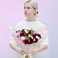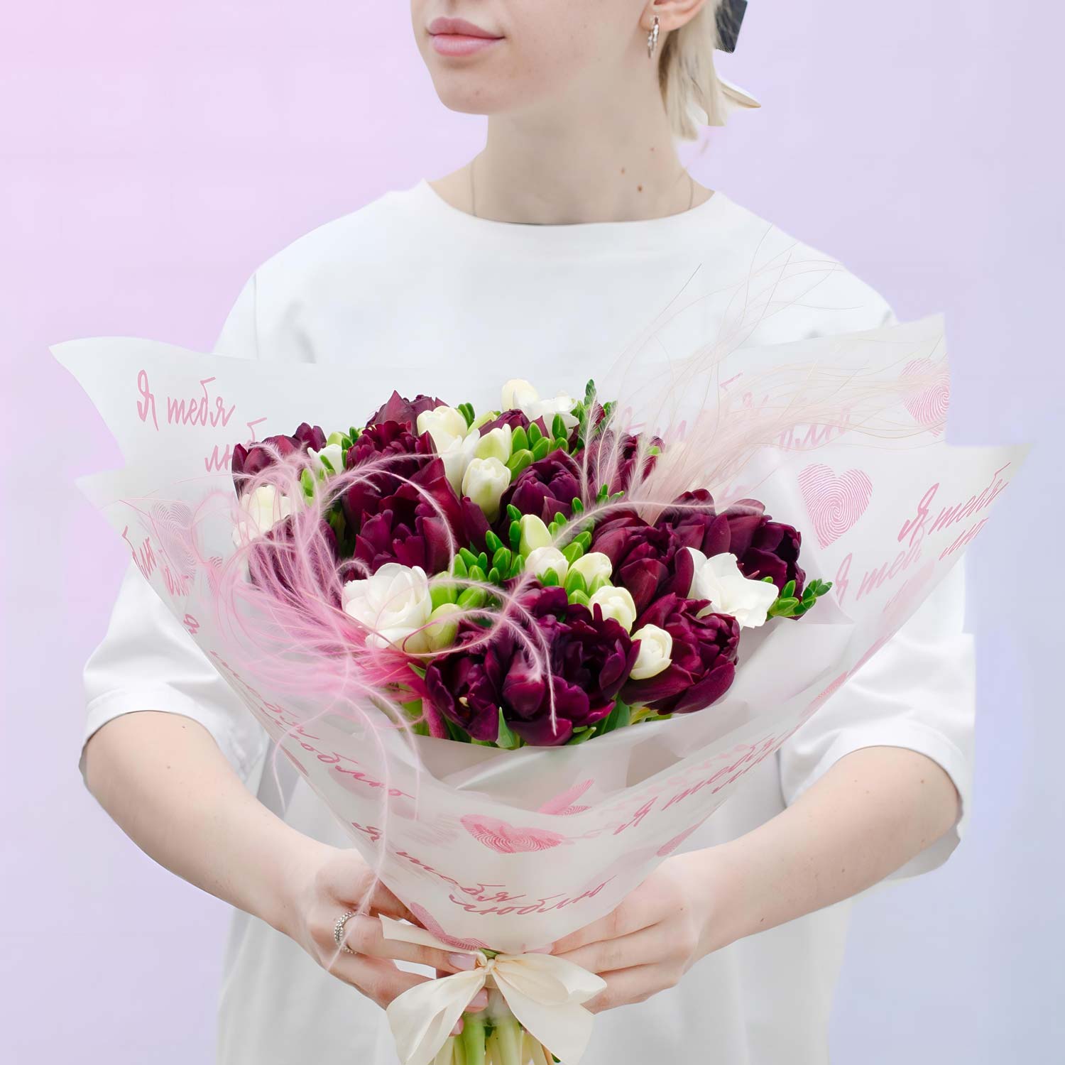 Эффектная игра контрастов и фактур. В этом букете мы соединили 15 пионовидных тюльпанов глубокого винного оттенка с 10 ветками белоснежной душистой фрезии. Легкость и динамику композиции придают 2 ветви декоративного ковыля.