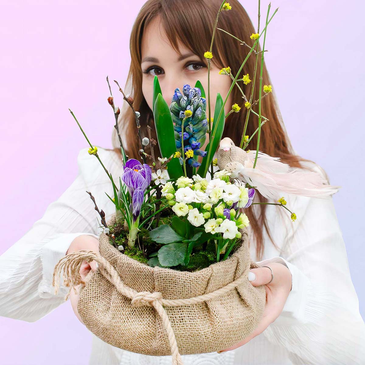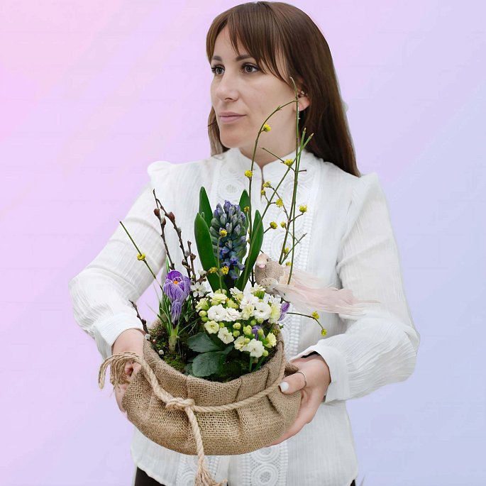 Оригинальная весенняя композиция из живых растений, высаженных в грунт. Работа выполнена в подчеркнуто природном эко-стиле, где базой служит мягкое текстильное кашпо, стилизованное под мешочек из натуральной мешковины и перевязанное джутовым шнуром.