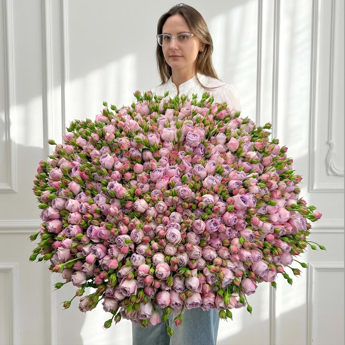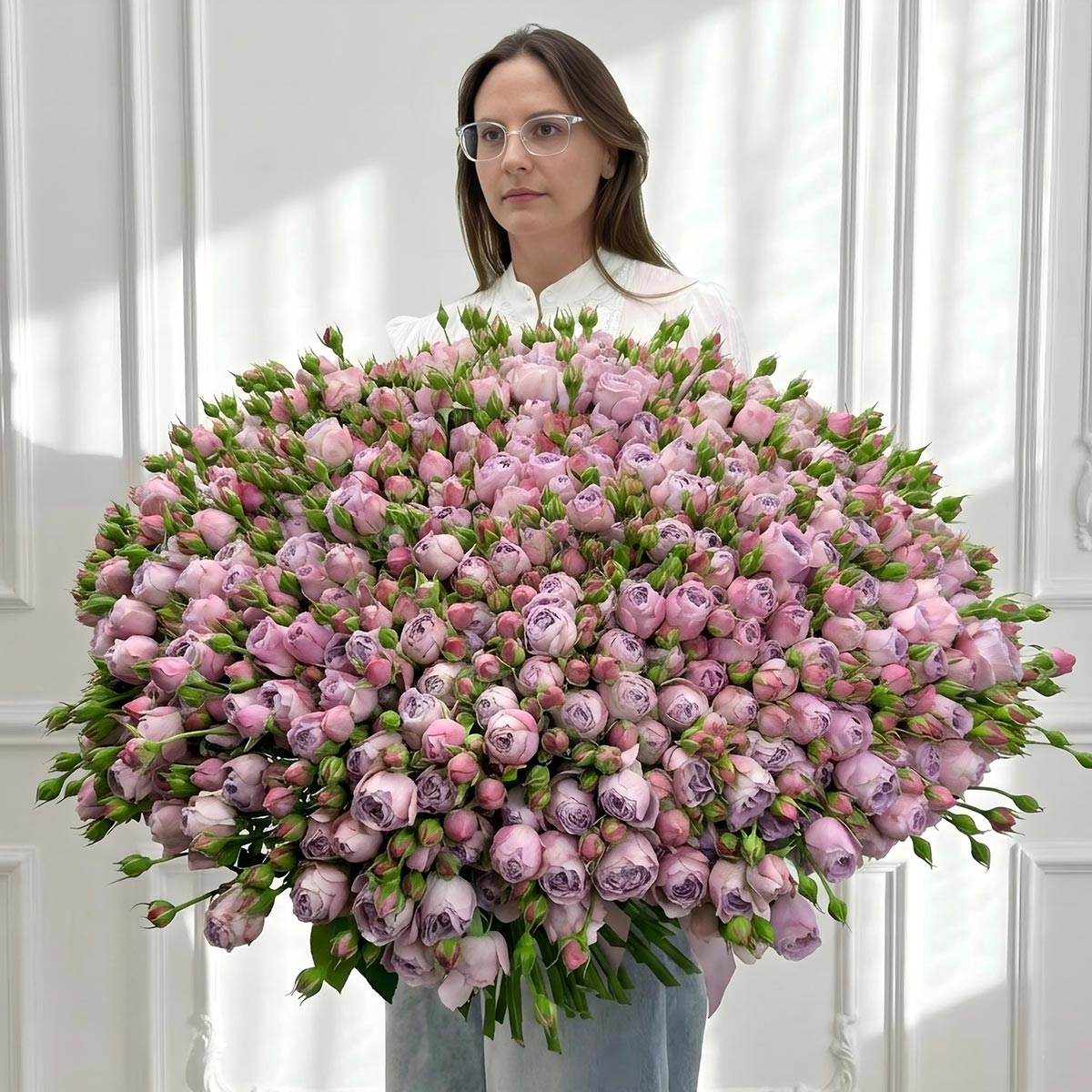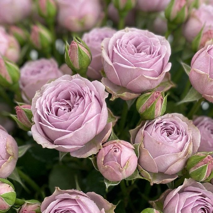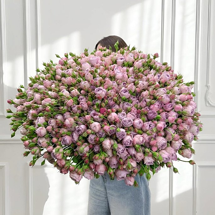 Роскошный, масштабный и по-настоящему впечатляющий букет, состоящий из 121 ветки премиальной кустовой розы сорта Лавандер Баблз. Это не просто флористическая композиция, а огромное цветочное облако, которое создает безусловный wow-эффект благодаря своим размерам и потрясающему пыльно-лиловому оттенку.