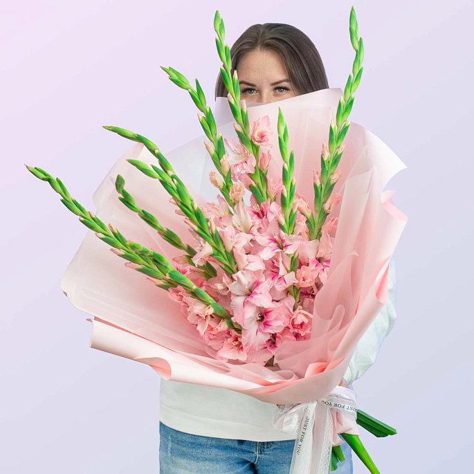 Высокие розовые гладиолусы смотрятся стильно и аккуратно. Лаконичная упаковка подчёркивает естественную красоту цветов.