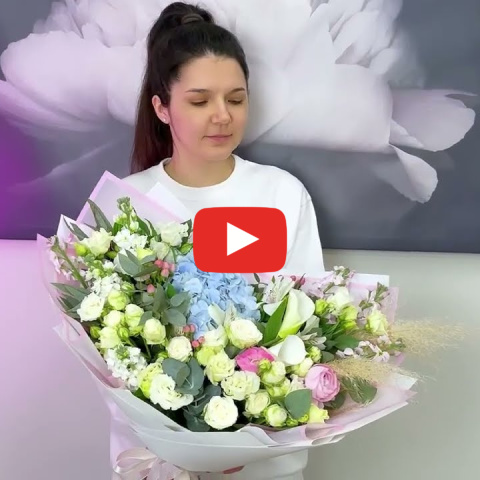 Легкий и очень воздушный букет в сочетании белых, нежно-голубых и розовых оттенков.Состав букета: