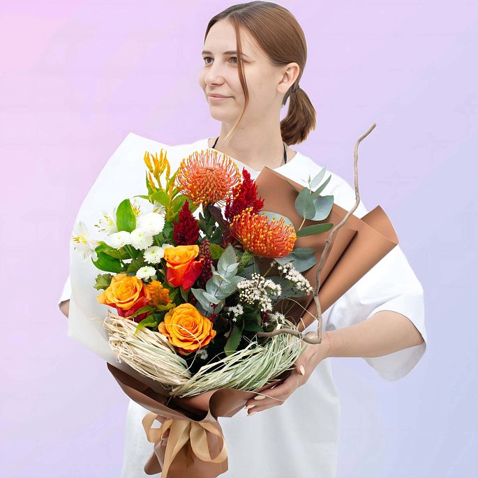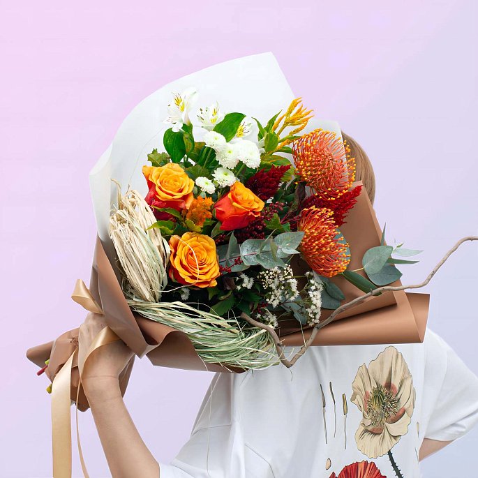 Яркий, но со вкусом: тёплые оранжевые розы, экзотические протеи и фактурная зелень собраны в осенний микс, который выглядит дорого и современно. Это не стандартный подарок, такой букет выбирают люди, которые хотят выделиться и подарить эмоцию.