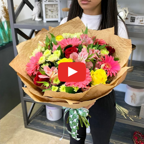 Букет из 5 розовых гербер, 4 красных роз "Ред Наоми", 3 желтых роз, 5 розовых альстромерий, 3 зеленых хризантем, рускуса. Упаковка жатая крафт бумага.Примерный размер букета: 45*45 см