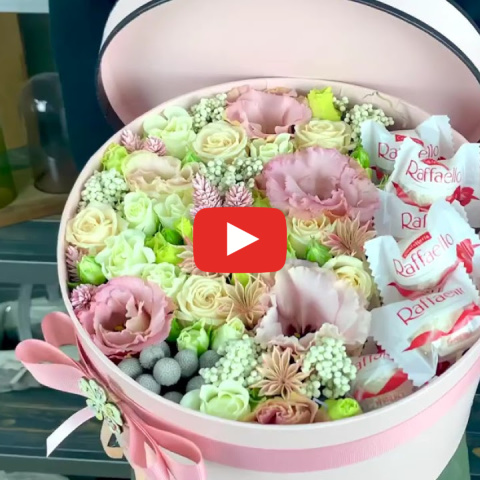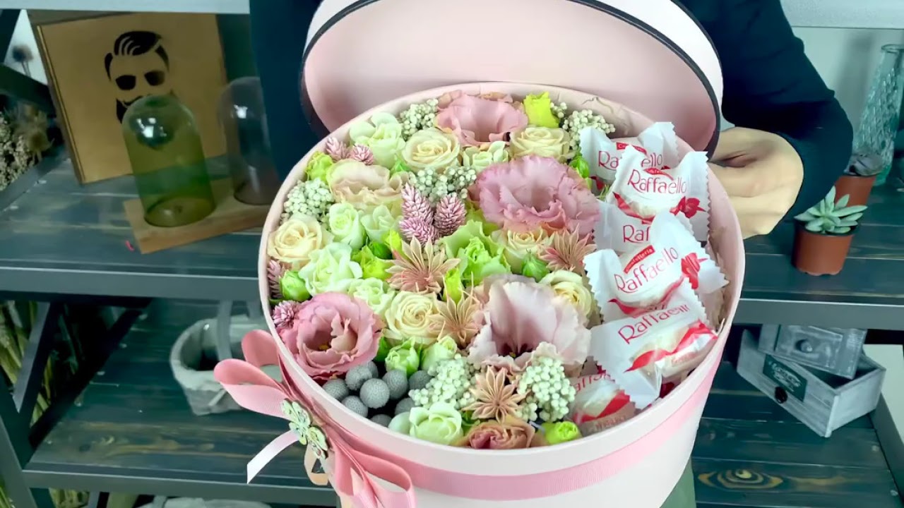 Нежнейшая шляпная коробка с воздушной эустомой и миксом цветов, дополненная конфетами Раффаэлло.Состав: