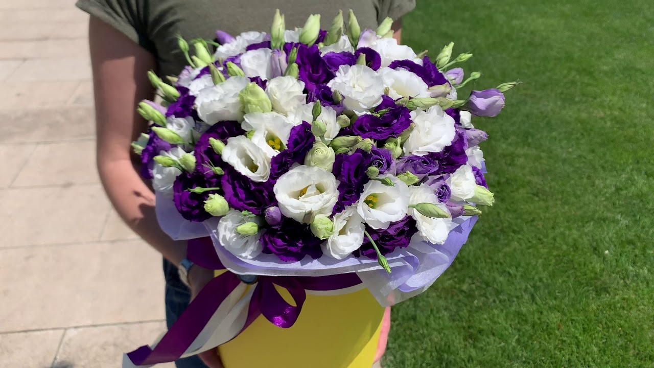 Желтая шляпная коробка с лентами и 29 ветками эустомы белого и фиолетового цвета.