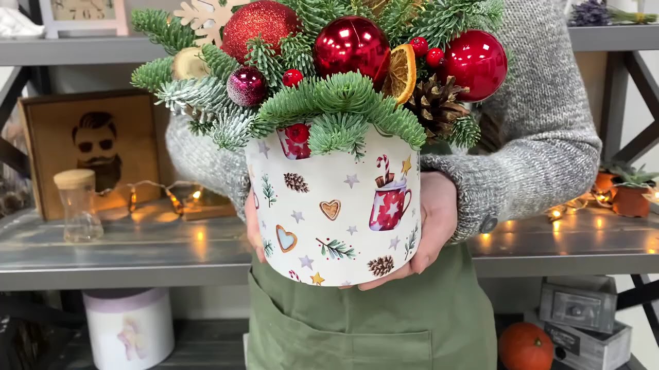 Небольшой новогодний цилиндр с ароматными еловыми веткам, елочными шарами, сушеными дольками апельсинок, шишками, натуральным деревом и декоративными ягодами