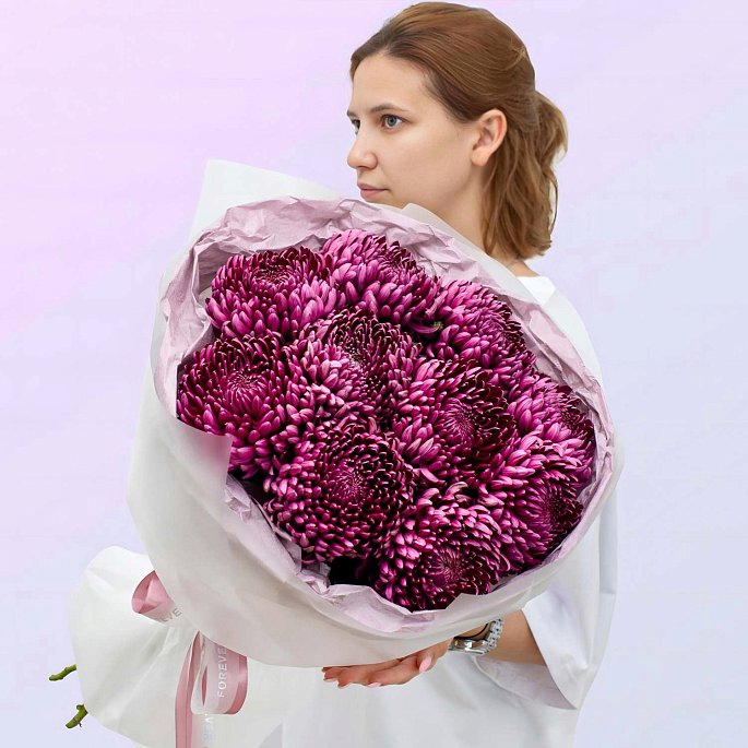 Яркие, пышные и выразительные — эти хризантемы мгновенно привлекают внимание. Сорт «Бигуди» стал настоящим фаворитом сезона: необычный оттенок, крупные соцветия и роскошный объём делают этот букет любимцем девушек и идеальным выбором для эффектного подарка.