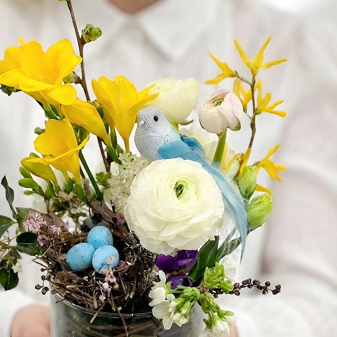 Совет флориста по уходу: В прозрачной стеклянной вазе удобно контролировать уровень жидкости. Поддерживайте объем чистой прохладной воды на уровне 3–5 см от дна. Важно, чтобы стебли живых цветов стабильно доставали до воды, но само декоративное гнездо из веток не погружалось в нее слишком глубоко. Размещайте композицию вдали от батарей и прямых солнечных лучей.