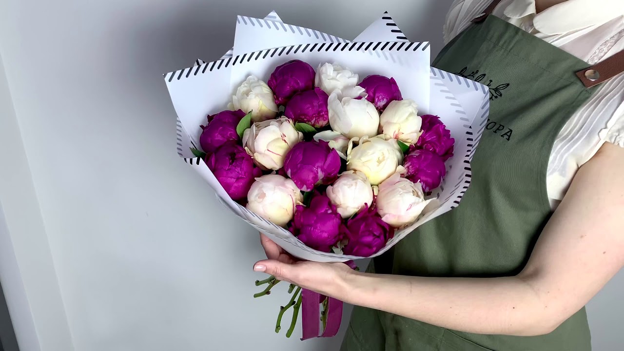 Букет из 19 крупных итальянских малиновых и кремовых пионов.