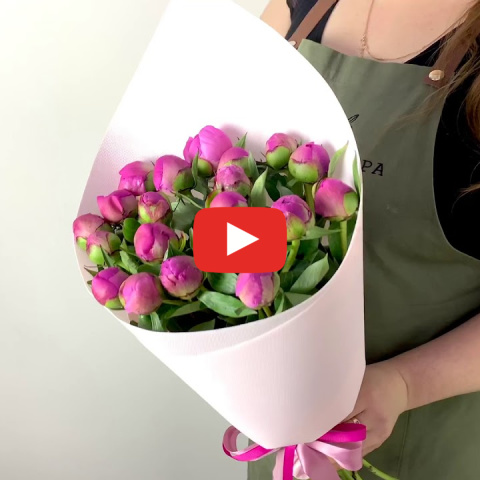 Букет из 19 малиновых пионов. Пионы раскрываются в воде и в комнатной температуре в течение дня. Становятся крупными, яркими и ароматными.