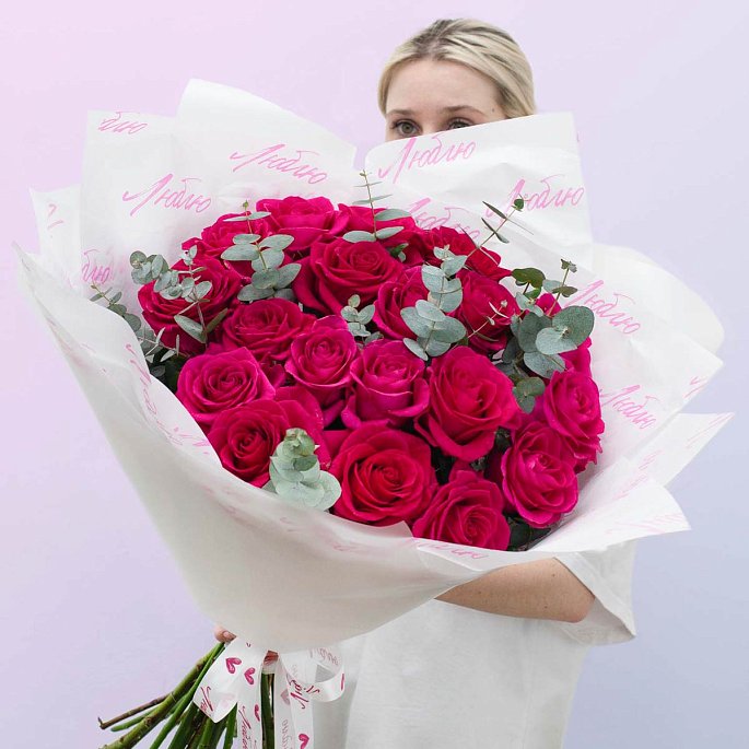 Взрыв цвета и эмоций. Букет из 19 роз сорта Pink Floyd в обрамлении свежего эвкалипта. Этот сорт знаменит своим насыщенным цветом фуксии и легким сладковатым ароматом.