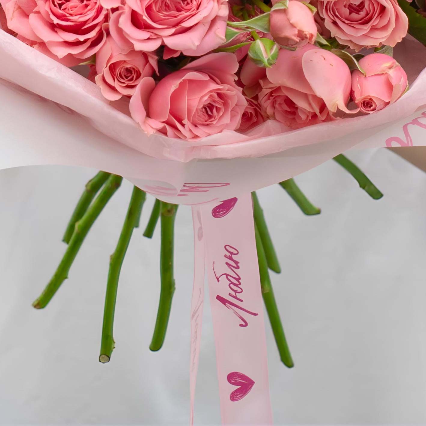 – Говорящая упаковка: Надписи «Люблю тебя» и лента с сердцами делают этот букет готовым признанием в любви — вам даже не нужна открытка;