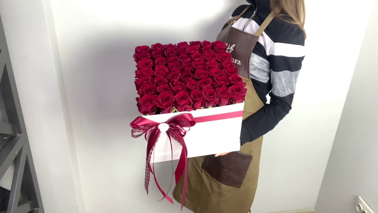 Квадратная коробка с 49 красными розами.