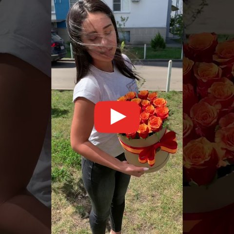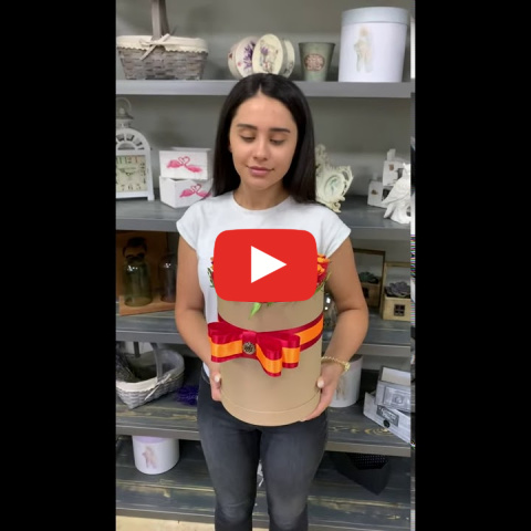 Крафт цилиндр из 19 огненных роз сорта "Испания" с контрастной оранжево-красной лентой.Диаметр цилиндра без цветов: 20 см