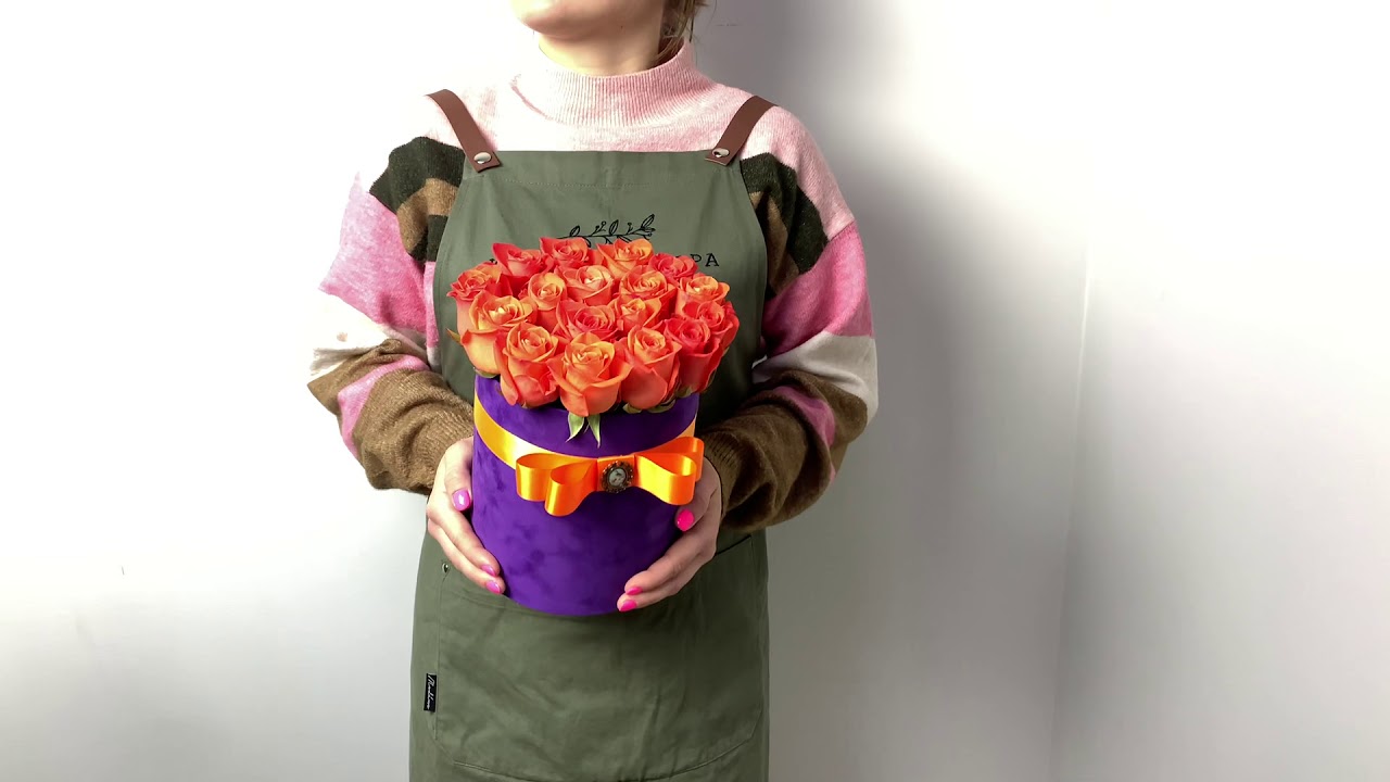 Бархатный фиолетовый цилиндр с 19 оранжевыми розами сорта "Вау" с контрастной оранжево лентой.