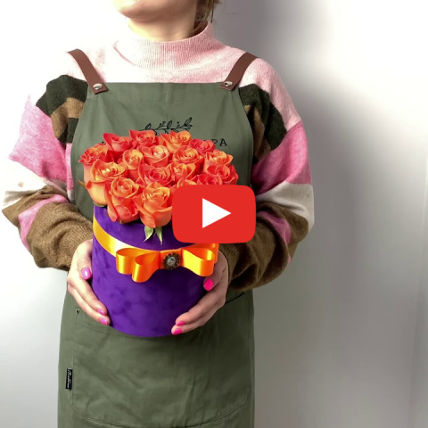 Бархатный фиолетовый цилиндр с 19 оранжевыми розами сорта "Вау" с контрастной оранжево лентой.Диаметр цилиндра без цветов: 20 см