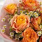 – Теплая палитра: Сложный градиентный окрас лепестков розы в сочетании с белыми и желтыми акцентами матрикарии создает очень уютное, светлое настроение;