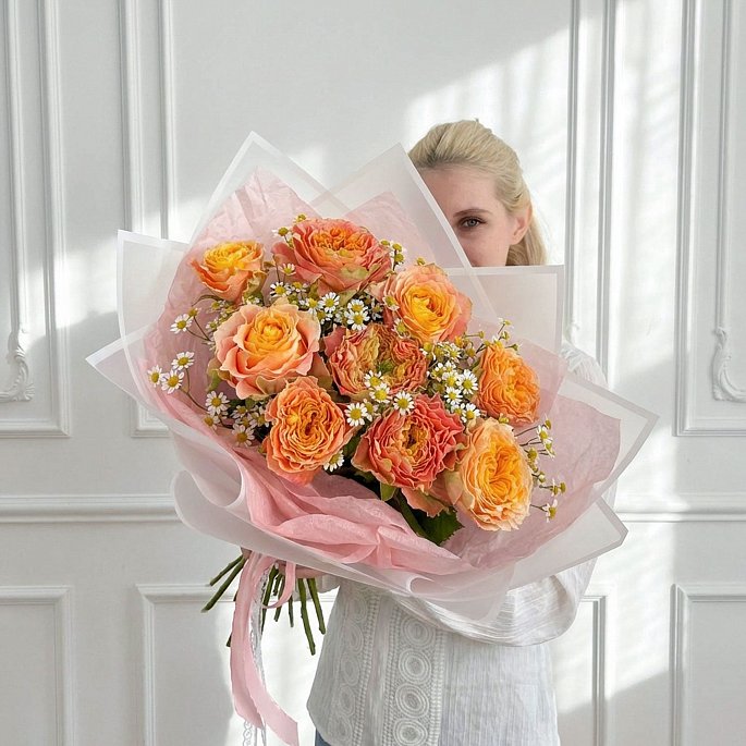 Элегантный и очень нежный букет, построенный на актуальном контрасте классической флористики и полевой эстетики. Основу композиции составляют 9 крупных пионовидных роз теплого персикового оттенка, объем которых гармонично дополнен россыпью мелкой кустовой ромашки (матрикарии).