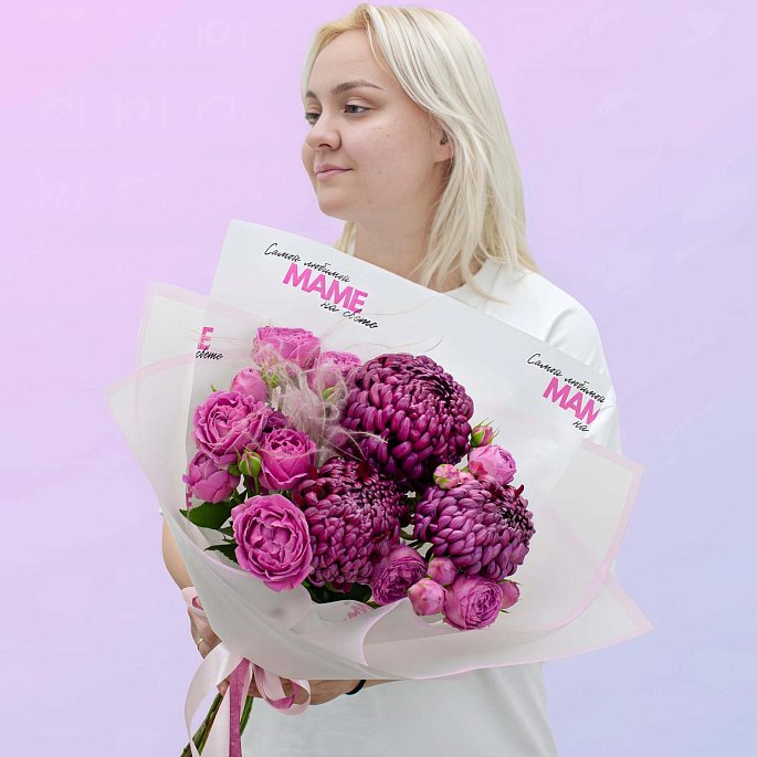Легкий, теплый и очень приятный букет: сочетание воздушных пионовидных роз и хризантем Бигуди. Получается мягкая текстура, красивые оттенки и тот самый уютный вайб, который так нравится мамам.