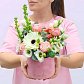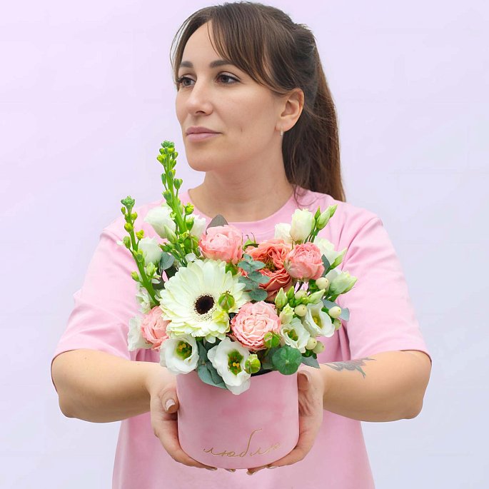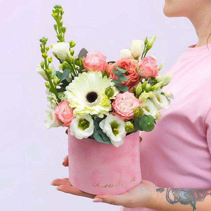 Мы собрали микс из белой герберы, кустовых роз и воздушной эустомы в премиальную шляпную коробку. Главная деталь — корпус обтянут мягким розовым бархатом, а золотая надпись «Люблю» делает подарок красноречивее любых слов.