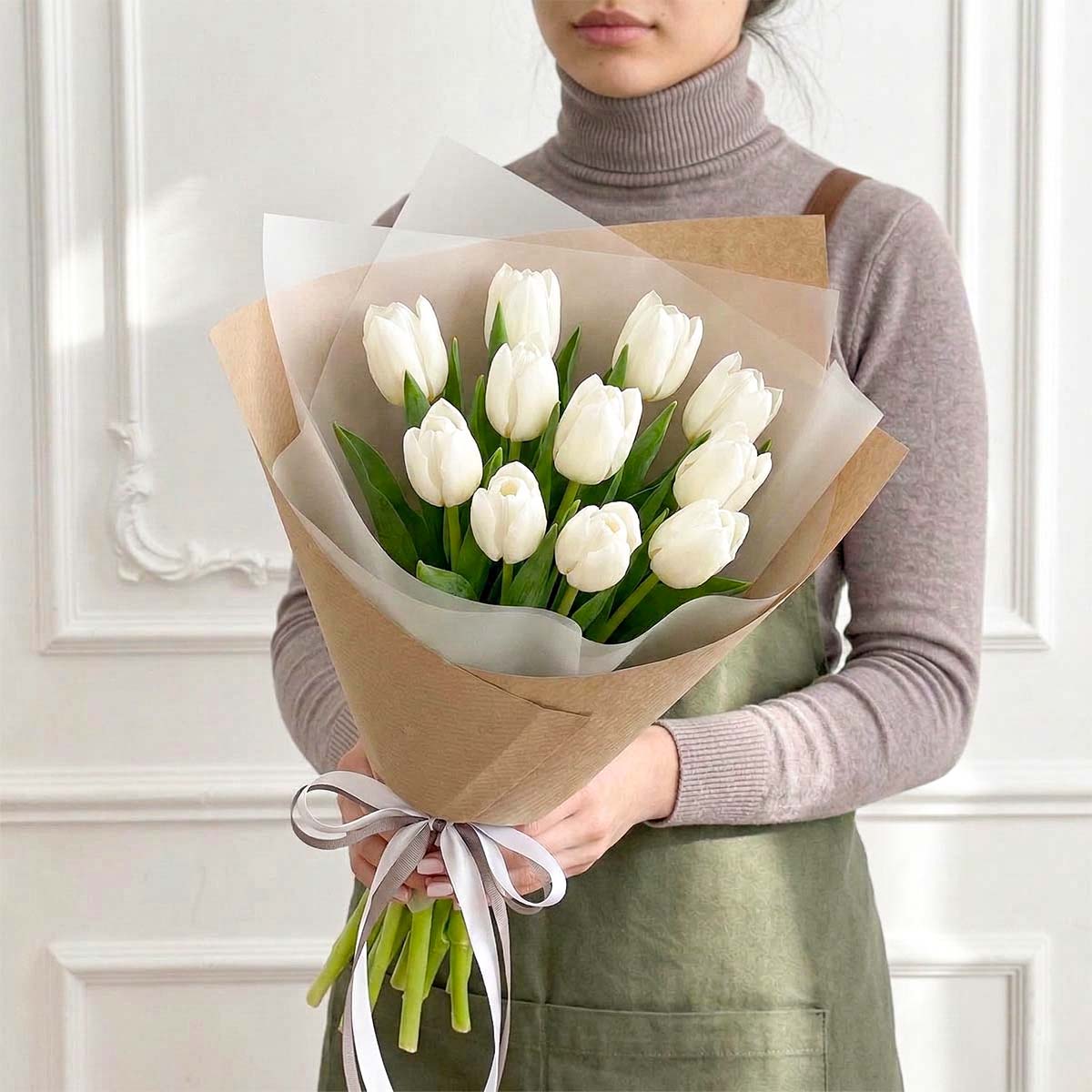 Лаконичный и невероятно свежий весенний букет, состоящий из 11 белоснежных тюльпанов. Эта монокомпозиция подкупает своей естественной простотой и элегантностью. Двухслойная упаковка из полупрозрачной матовой пленки и фактурной крафтовой бумаги идеально подчеркивает хрупкость и чистоту бутонов, не перегружая работу лишними деталями.