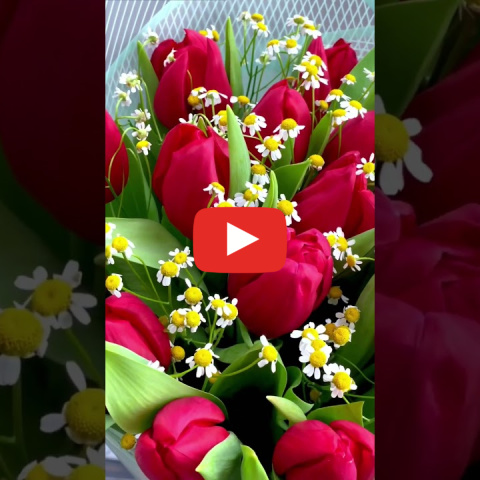 Букет из 19 ярко-красных тюльпанов с танацетумом (мелкоцветная ромашка).!Ограниченное предложение!