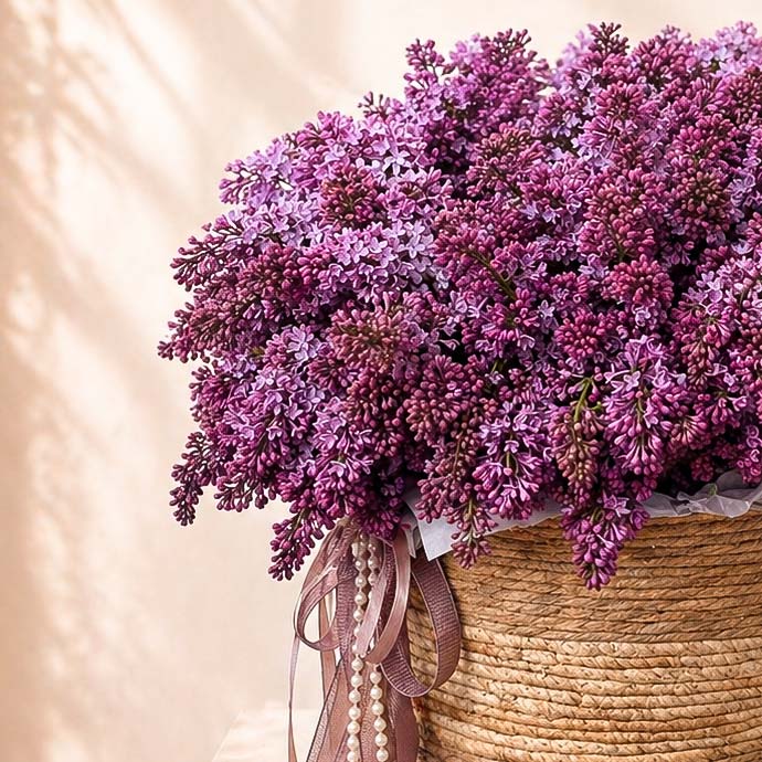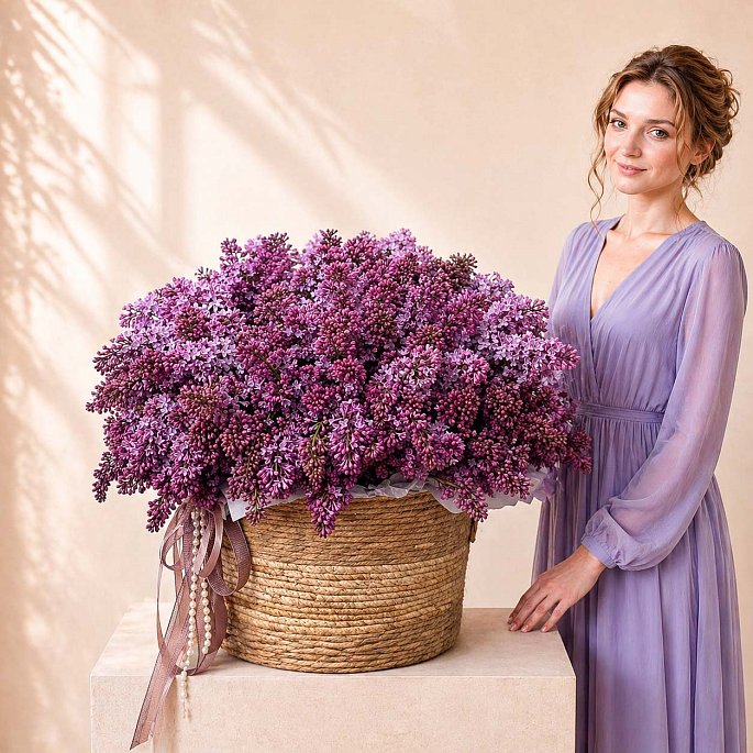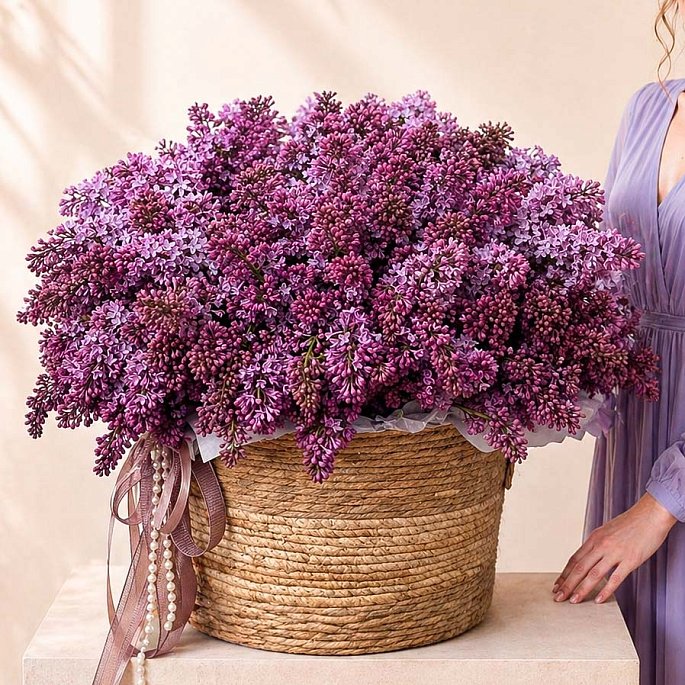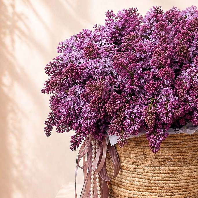 Пышная и невероятно ароматная композиция, полностью собранная из веточек сортовой сирени в стильной плетеной корзине. Это именно то сезонное решение, которое мгновенно наполняет дом атмосферой цветущего сада. Декор из атласных лент и жемчужная нить добавляют работе изящества и делают её полноценным украшением интерьера.
